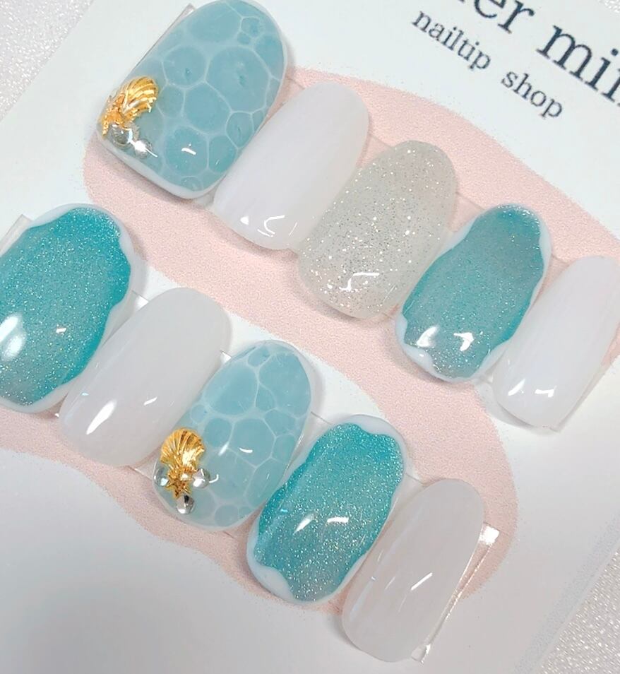 〇透明感あふれる夏の海を指先に閉じ込めたような、爽やかブルーのネイルチップ♪
